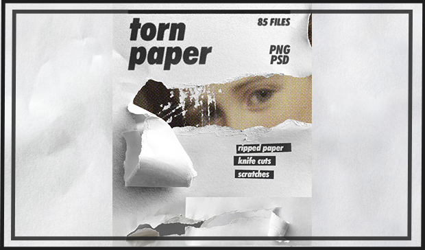 Awesome collection of 85 Paper Pieces packed in one massive bundle of 30 isolated torn paper PNG elements with transparent backgrounds! Plus, 15 PSD mockups where you can easily place your image or text on top in Photoshop. Also, there are 20 isolated PNG knife cuts and 20 scratches.