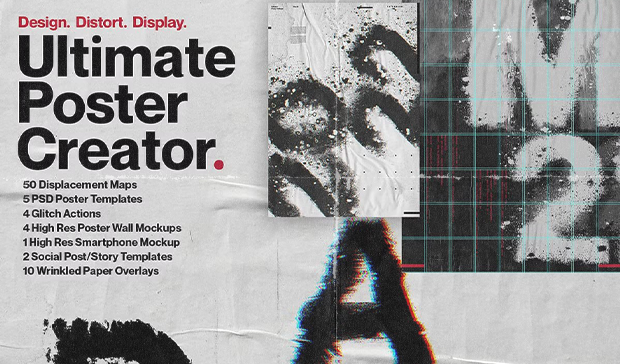 The Ultimate Poster Creator isn’t just a huge set of 50 high resolution displacement maps to add incredible interest and dynamics to your designs, but also, 5 professionally designed .Psd Poster templates. These templates are set up with grids, the fundamental building blocks of any and all professional design layout. Over 20 years worth of experience, working as an award winner graphic designer, has been distilled into these templates and the two very specific grids used.